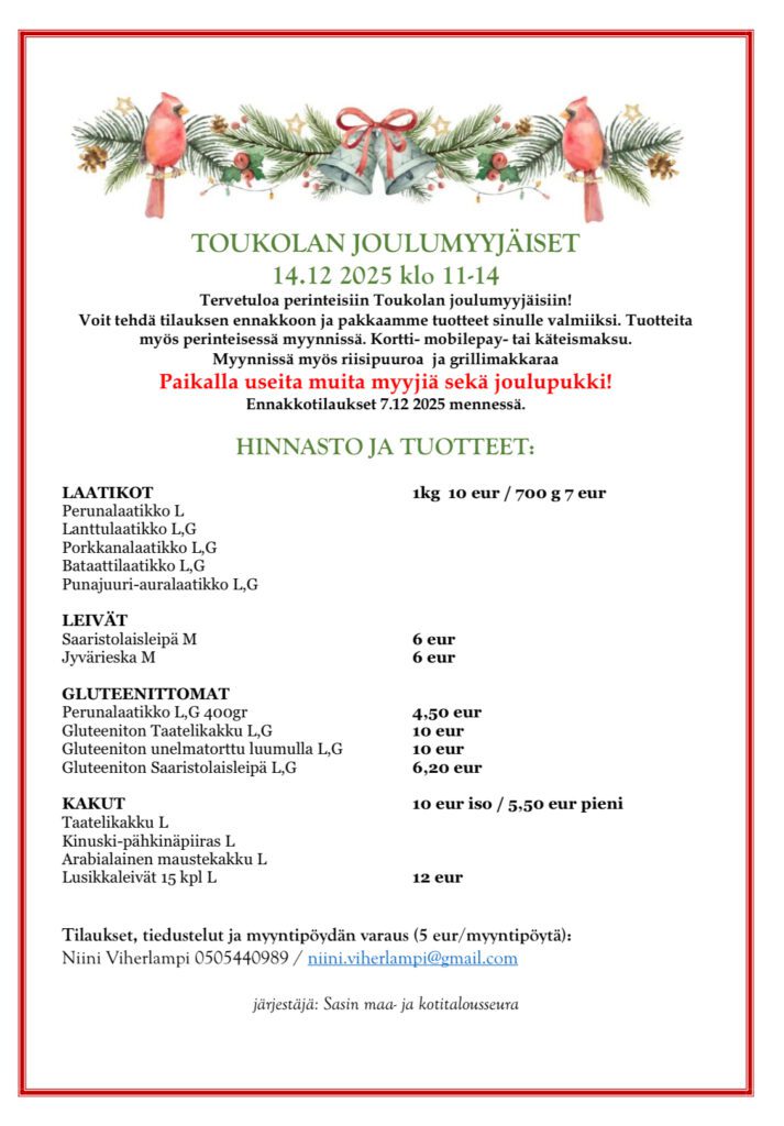 Millainen on hyvä kylä tai asuinympäristö? Miten sen parhaita puolia voitaisiin vaalia? Vaatisivatko jotkin asiat muutosta? Sasin seudun maa- ja kotitalousseuran tavoitteena on koota kylän ja lähiseudun väkeä yhteiseen virkistävään toimintaan ja kehittämään asuinympäristöä viihtyisämmäksi. Kotisvuillamme voit tutustua seuramme nykyiseen toimintaan ja sen keskipisteenä toimivaan juhlatalo Toukolaan. Kutsumme samalla myös sinua toimintaan mukaan, sillä parempaa kylää voimme rakentaa vain me, kyläläiset, yhdessä.